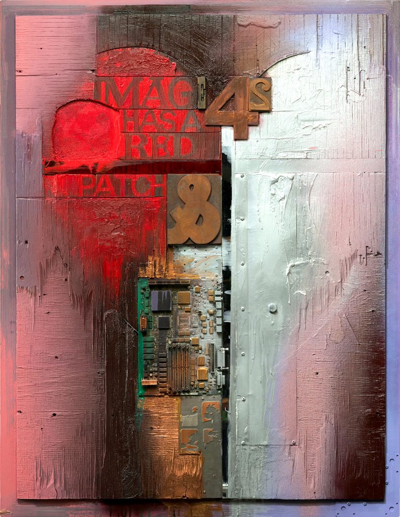 This piece is one in a series of highly-textured mixed media collage artworks. Ripped distressed plywood has been used as the base and integrated with other bits of 3D materials which include artifacts of past communication mediums, typography, computer parts, pieces of mirror, Plexiglas, aluminum and paint. This particular piece of wood panel had a hole cut into it which Kearns decided to focus on and patch providing the inspiration and the title.