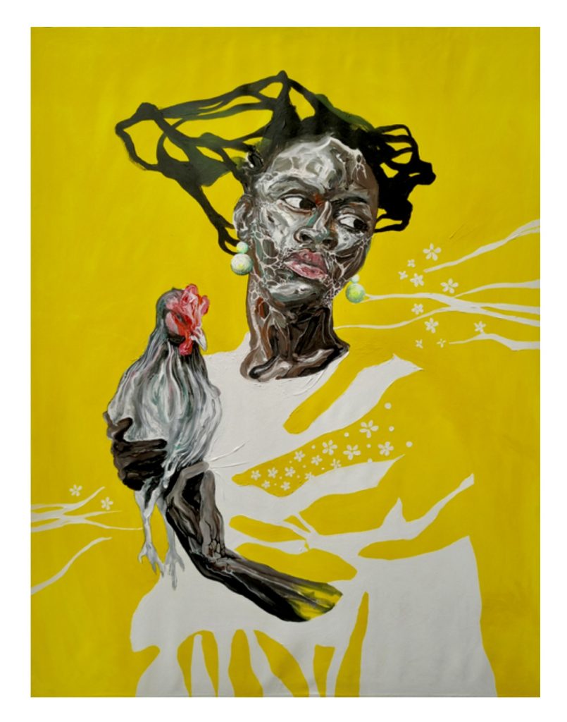 Sisqo Ndombe is a Congolese artist who makes figurative paintings with magical realist or surrealist elements. His work makes use of bright colors and shows subjects with ecstatic gazes. This may be read as a celebration of self and of identity. His paintings with their pairings of dual figures, with their holding of cockerels and flowers, speak to inheritance, beauty, complexity, and African spirituality.