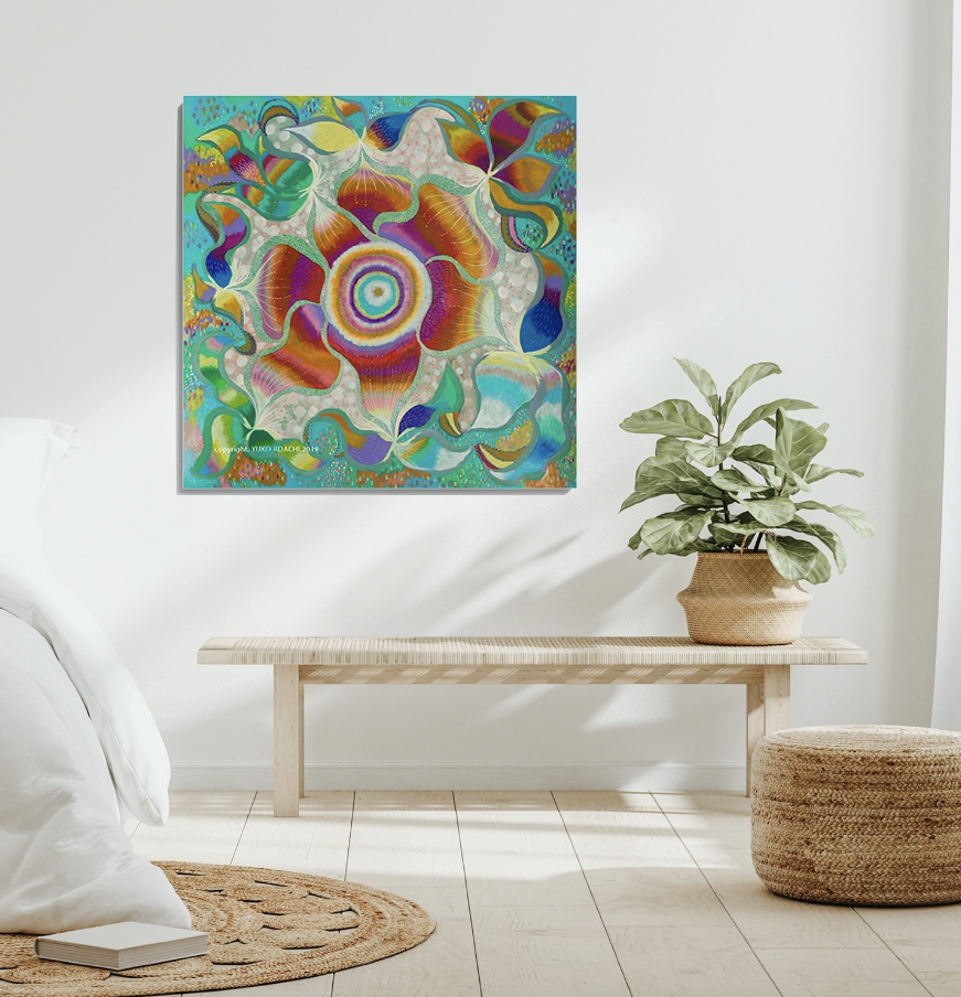 Adachi frequently helps clients incorporate art as the centerpiece of their homes. Her high-frequency paintings often become the focal point of vibrant living spaces, harmonizing with the rest of the decor. Her “lightcode activation” artwork, for example, is designed to inspire joy, peace, and love while promoting meditative relaxation.