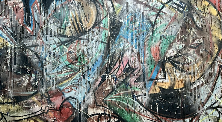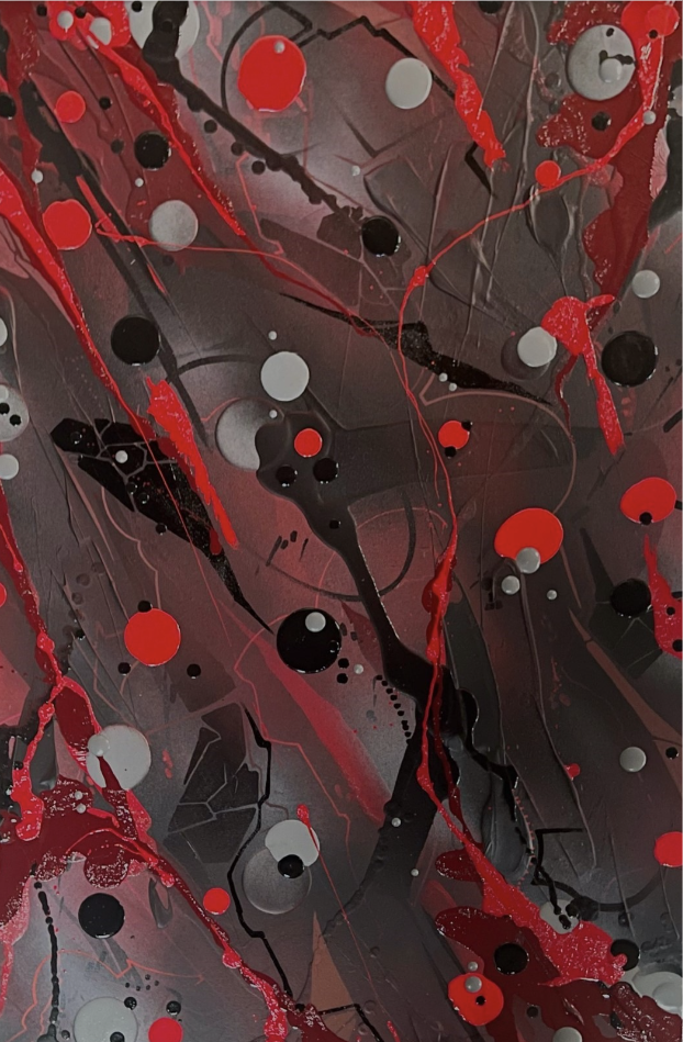 Pulling from the history of the city walls and the earthy tones of the rural landscape, The Evolution of Mark Making reflects the dynamic interplay between the urban and natural worlds. It investigates the moments where chaos and control intersect, and the journey through emotional release. Working with a wide array of materials, including pastels, spray paint, acrylic, ink, wax, house paint, and charcoal, Hinsdale honors the energy contained in each media. He acts as a conductor, guiding the materials through layered movements of harmony and dissonance. Every mark—whether chaotic or serene, deliberate or spontaneous—finds its place in the intricate tapestry of his work.