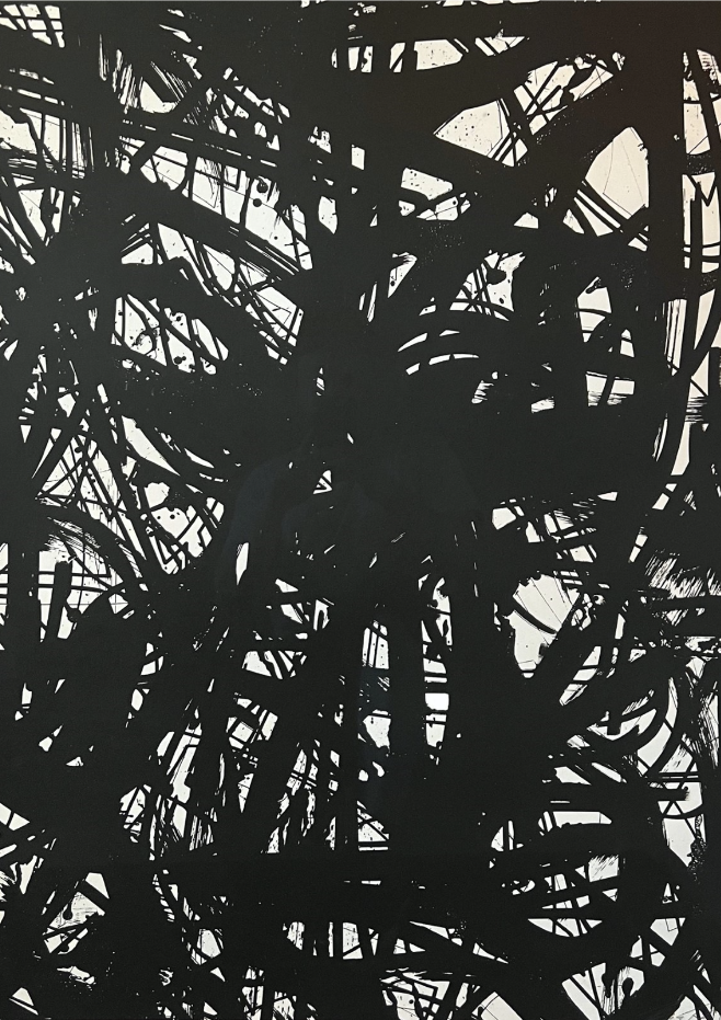 Raised amidst the vibrant chaos of Brooklyn and the serene expanses of upstate New York, Hinsdale has always been drawn to the tension between these contrasting worlds. Early in his career, his fascination with building and the physicality of space led him to explore wood and bronze sculpture. However, it was through experimenting with printmaking techniques like lithography and woodcut that his interest in the interplay of line and texture truly took shape. These experiments allowed him to reimagine his sculptural work in two dimensions, blending abstraction with the raw, expressive language of graffiti and laying the foundation for his distinctive artistic language. Much like the allover paintings of the abstract expressionist movement, Hinsdale’s work continuously engages the viewer’s eye with layered compositions where intention and spontaneity intersect.