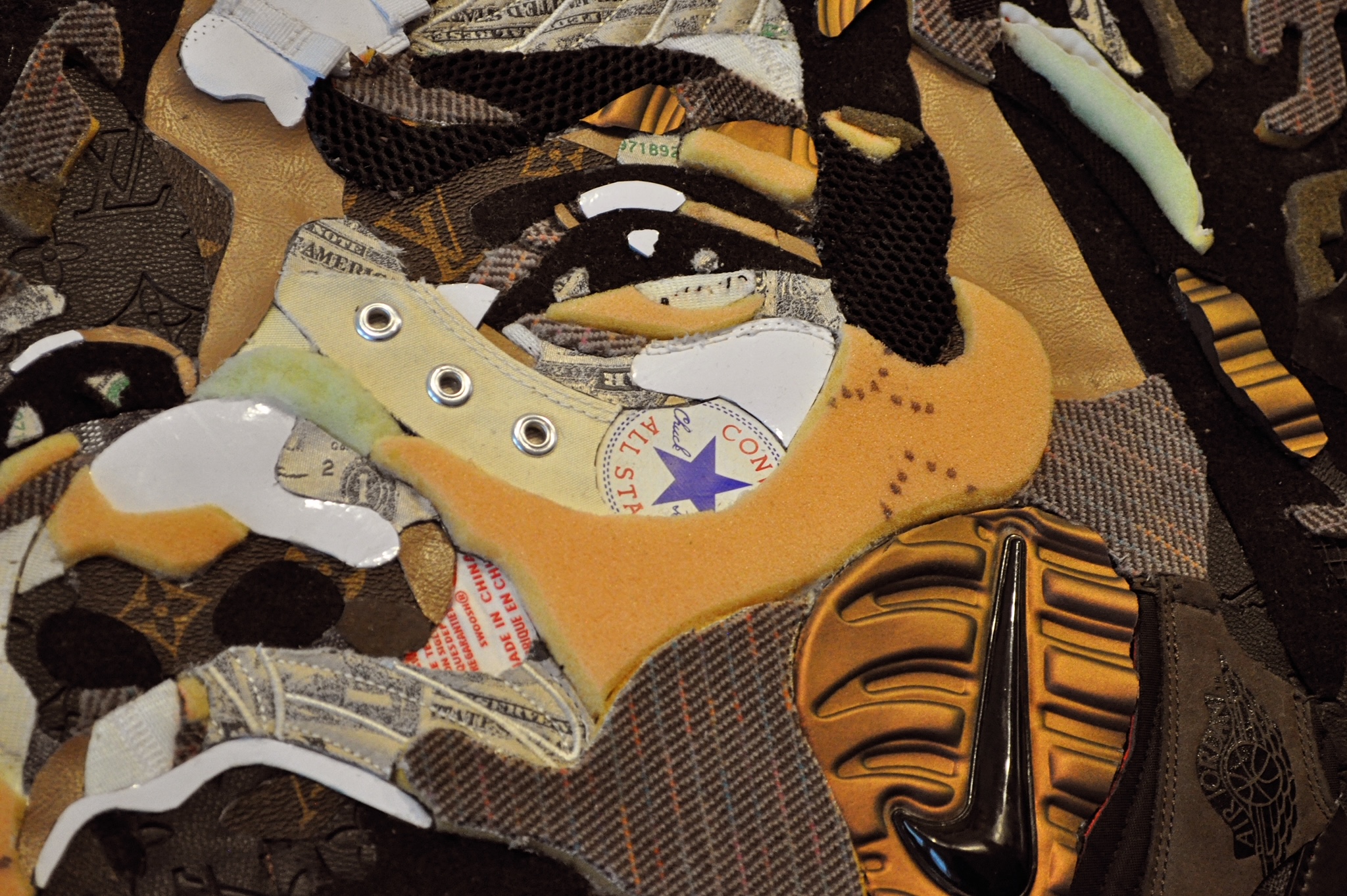 His work delves deep into our collective psyche, examining how material goods shape our self-concept. Though primarily using sneakers as the medium for his collage work, Justin has also integrated materials as diverse as Louis Vuitton fabrics and Tootsie Pop Wrappers, capturing the zeitgeist in every piece.