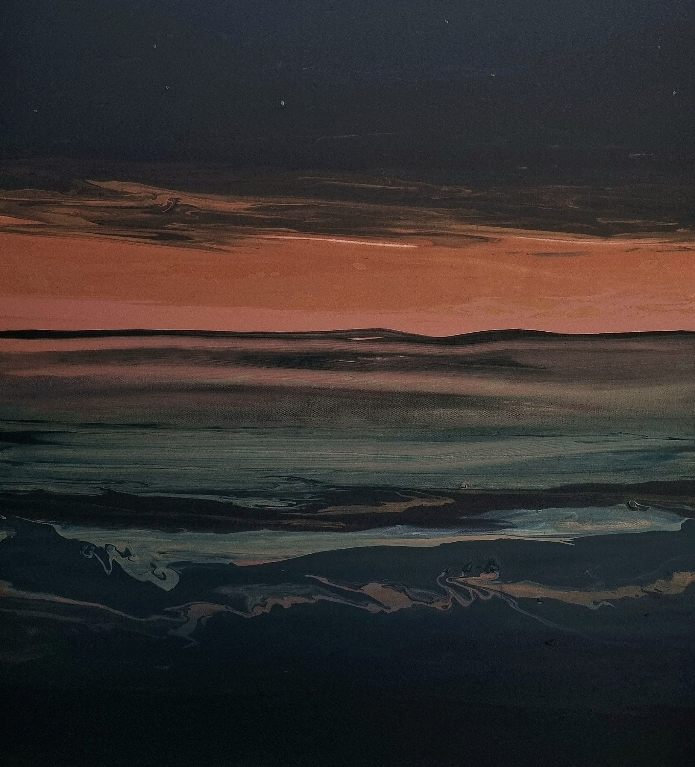 Lewis’s art focuses on intricate landscapes, seascapes, and star systems, capturing the essence of nature’s most awe-inspiring forms. His subjects range from vibrant coastal scenes and towering mountain ranges to the vastness of the night sky, each rendered on surfaces such as driftwood, ceramic tiles, reclaimed wood, canvas, and hardboard. Inspired by both the northern and southern hemisphere skies, Lewis employs a distinctive technique that combines various oil-based materials and solvents to create dynamic textures, vivid colors, and energetic compositions.
