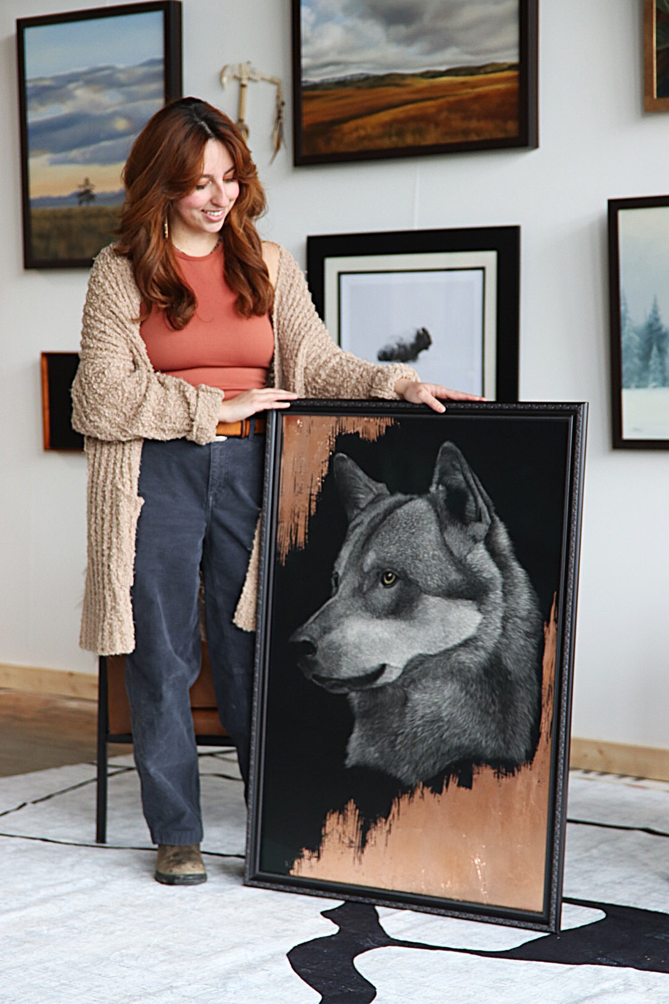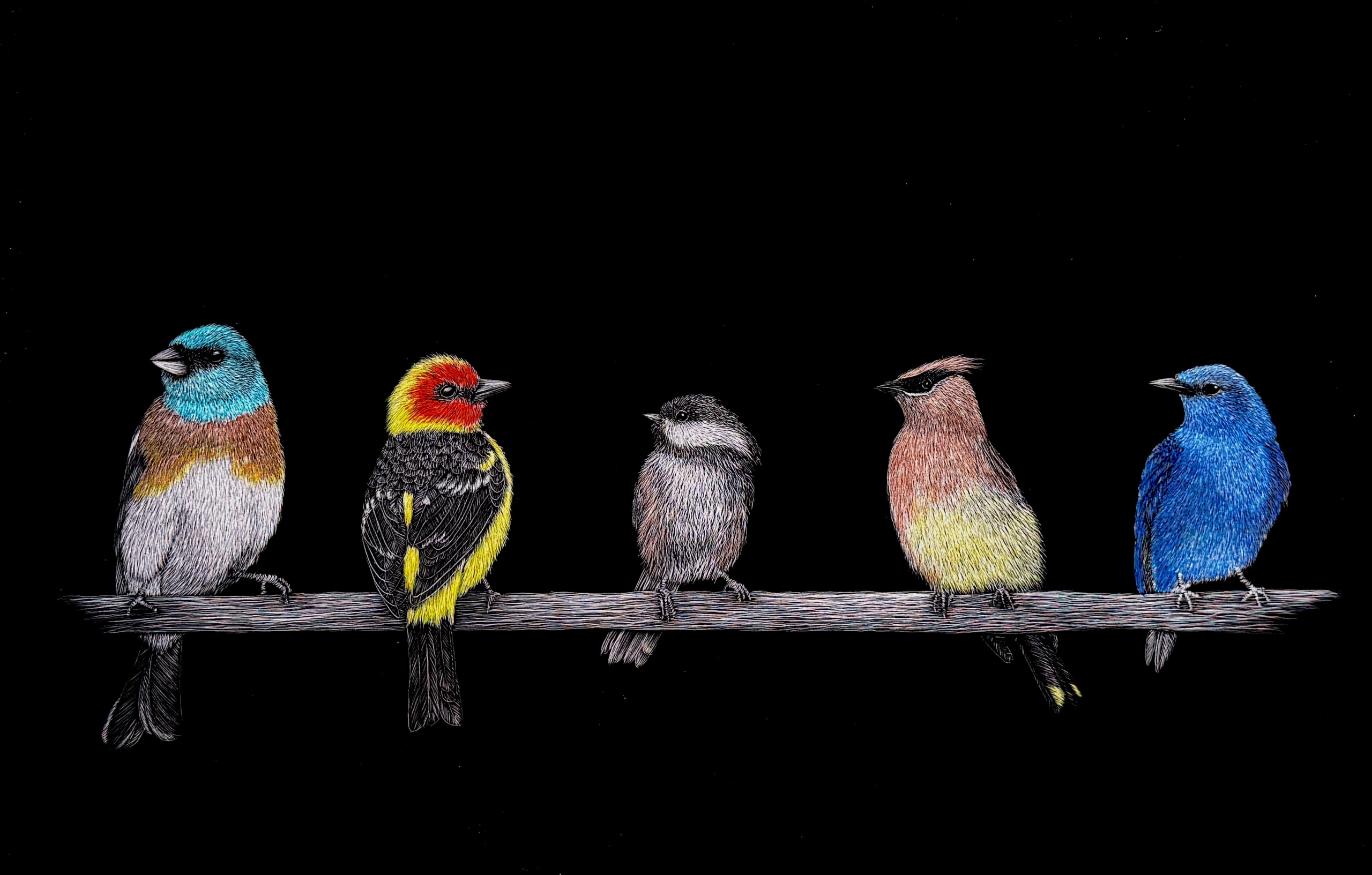 Based in Montana, Ariel Rodriguez is an exceptional scratchboard artist known for her intricate depictions of wildlife. With an x-acto knife to meticulously etch each line onto a scratchboard, Rodriguez captures the beauty and realism of Yellowstone’s iconic animals. Her process, akin to tattoo artistry, requires both patience and precision, with each scratch carefully placed to create stunningly lifelike details, from the texture of fur and feathers to the vivid expression in an animal’s eyes.