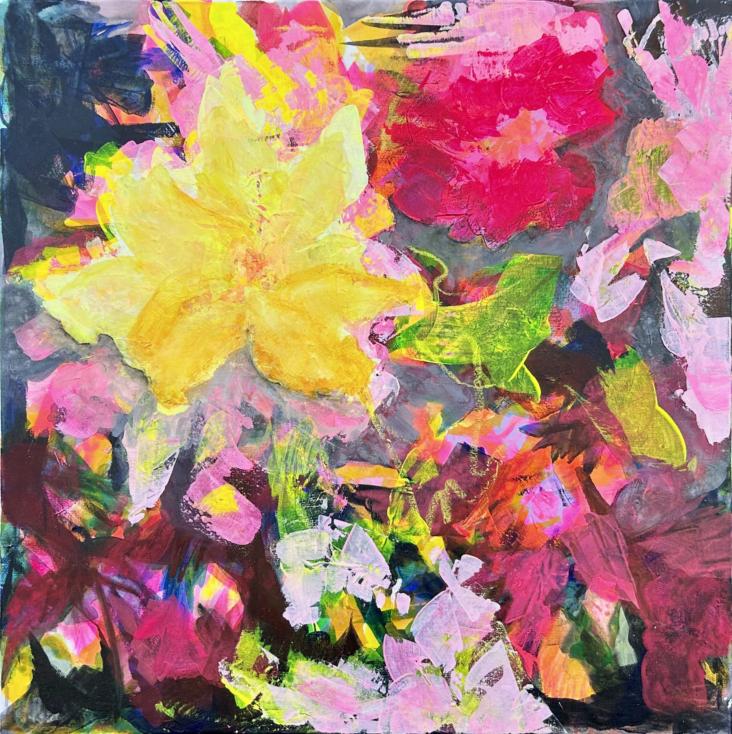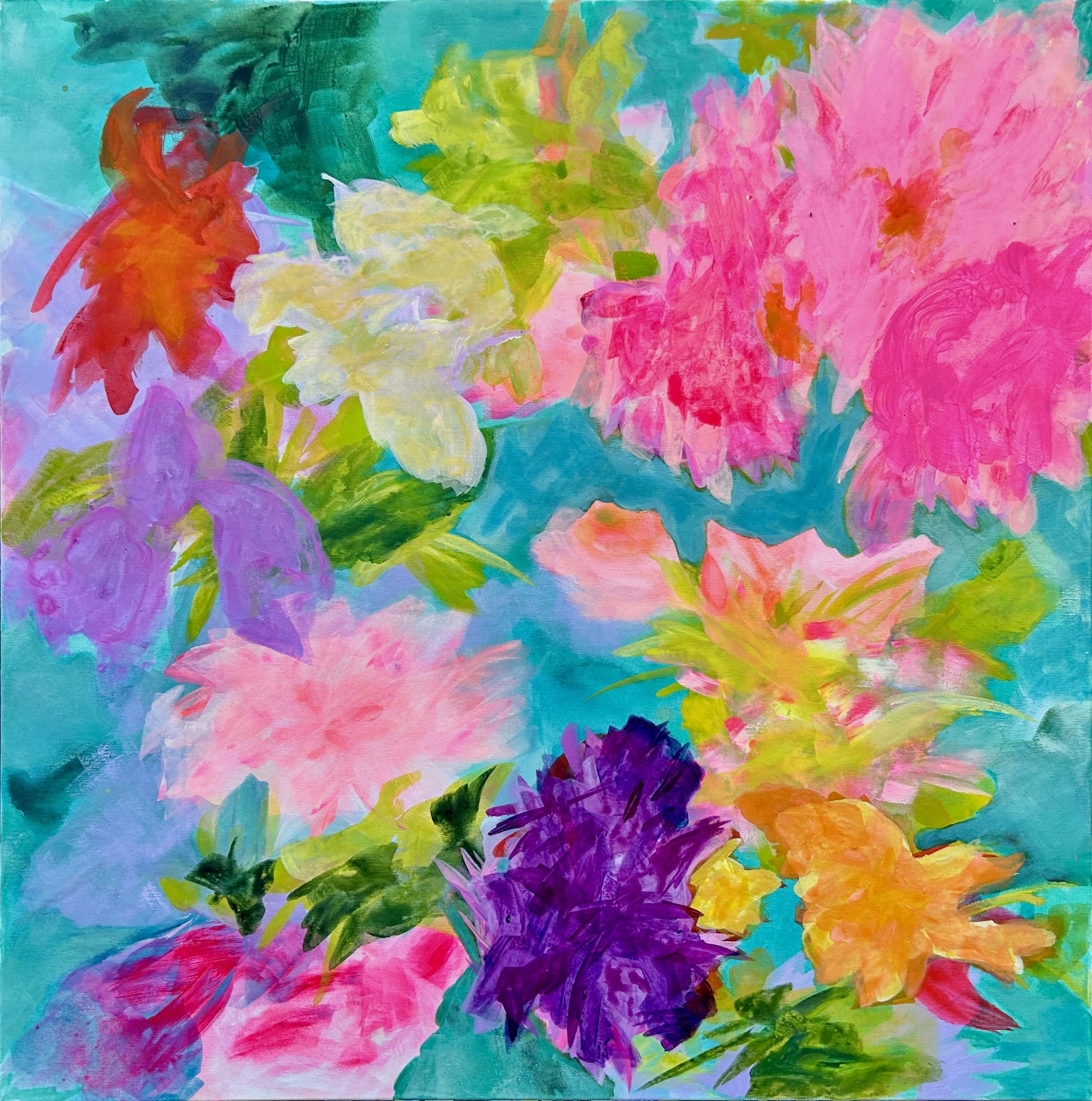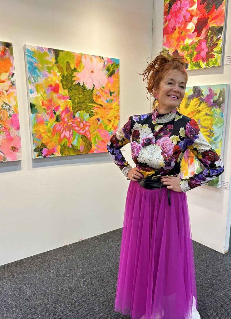 A: Go through the world with love, light, and floral scent in your heart! Enjoy the lightness and dance frequently and wildly because joy and ecstasy are the secrets of the universe! Dancing is exactly what I do before I start to come into my creative flow and to bring my acrylic candy colors to my canvas and show my soul!