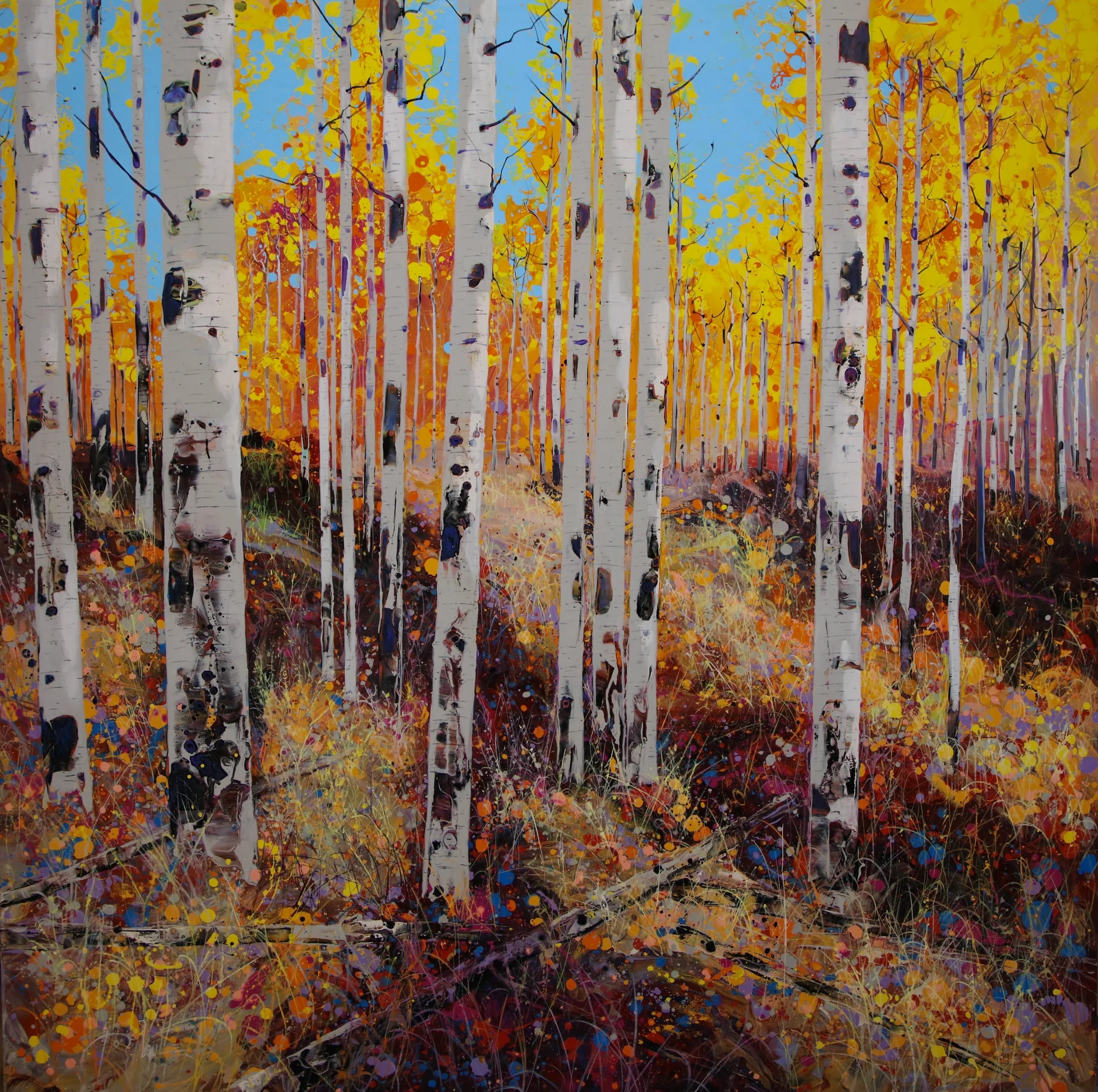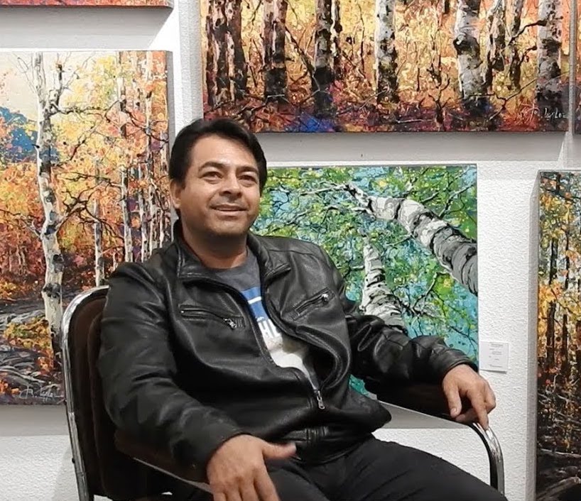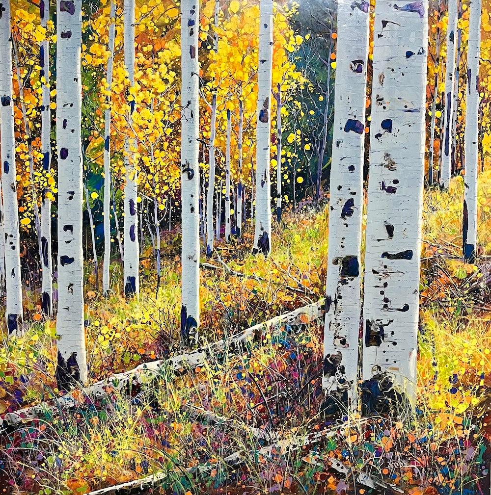 “Every time I look around me, I see this beautiful world full of colors and forms, and my first impulse is to transform my vision and emotions in a way that connects and reconnects people to Nature,” Ugalde reflects. This profound connection to the natural world manifests most powerfully in his signature subject: aspen trees and the ethereal dance of light through their leaves and trunks.